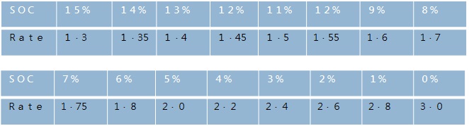 量測電芯在低電量時不同電流的電壓,在電芯低電量時進行修正,電量小於15%時開始修正SOC 。
